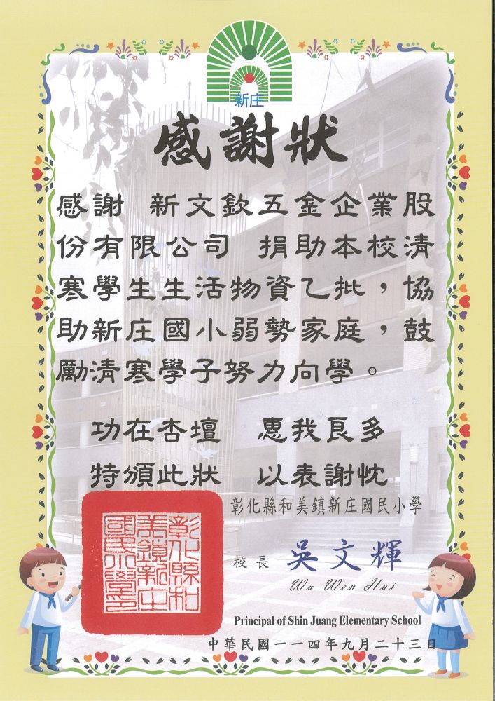 > 社會公益與關懷 > 社會公益-感謝狀-彰化縣和美鎮新庄國民小學